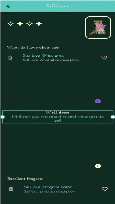 - self-love section: what I love about me, what I progressed in, what I have done well