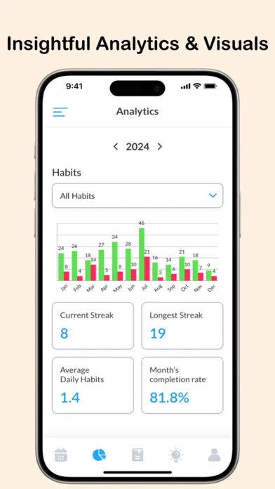 -Analytics and Insights: Gain insights into your habits with detailed analytics. Monitor your streaks, completion rates, overall habit performance, and more to understand your progress better.