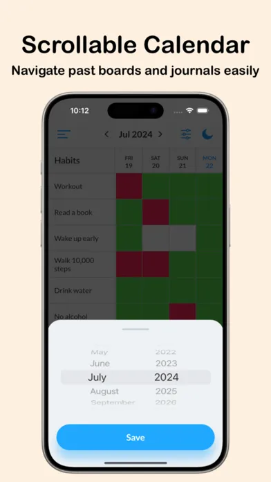 -Scrollable calendar: Easily review past habit boards and journal entries by navigating through previous months and years