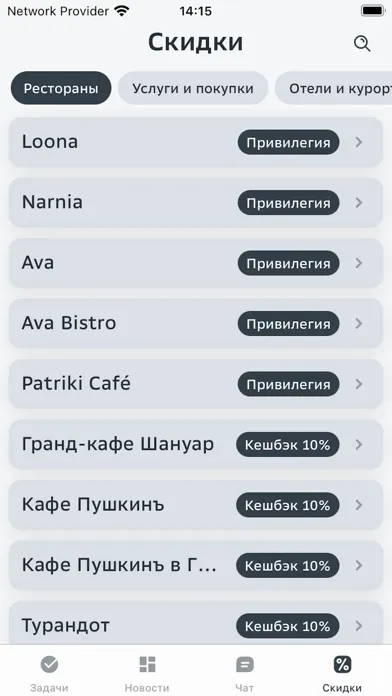 ∙ в разделе «Скидки» узнавать о привилегиях в ресторанах, отелях, салонах красоты, бутиках и не только