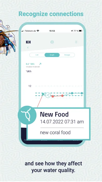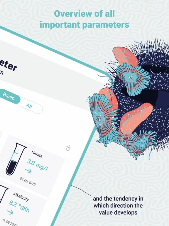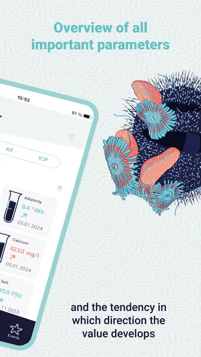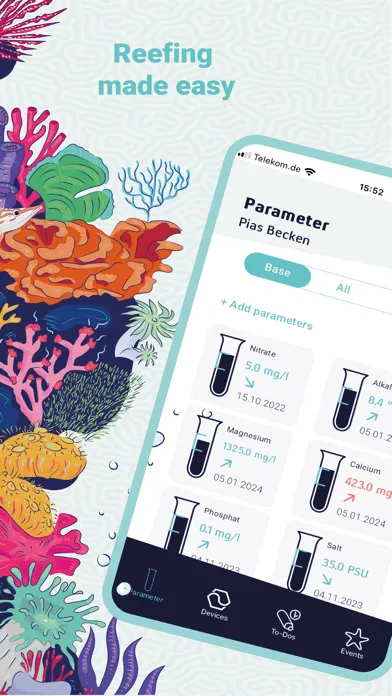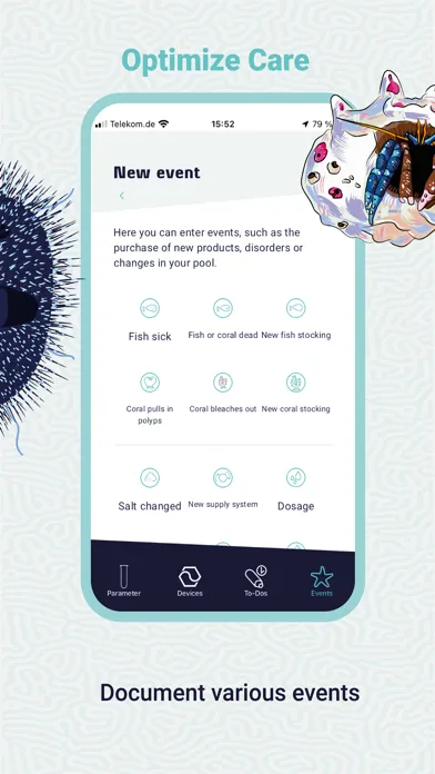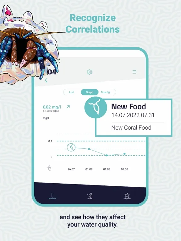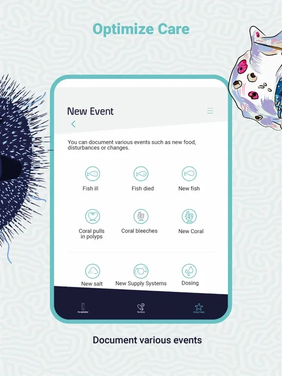 With Typus you can easily and quickly document your measured values. Typus provides you with a clear dashboard that allows you to keep track of your water quality at all times. The special feature of Typus? You can also enter events in your tank, for example new fish or coral stocking, but also incidents such as algae growth or the use of a new salt. This helps you to better understand and document the relationships in your aquarium. Typus also helps you to document your dosage of the individual elements, so that you can always keep an eye on everything concerning your water quality.