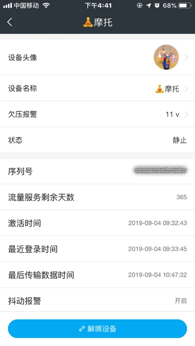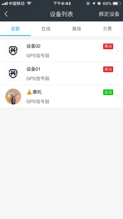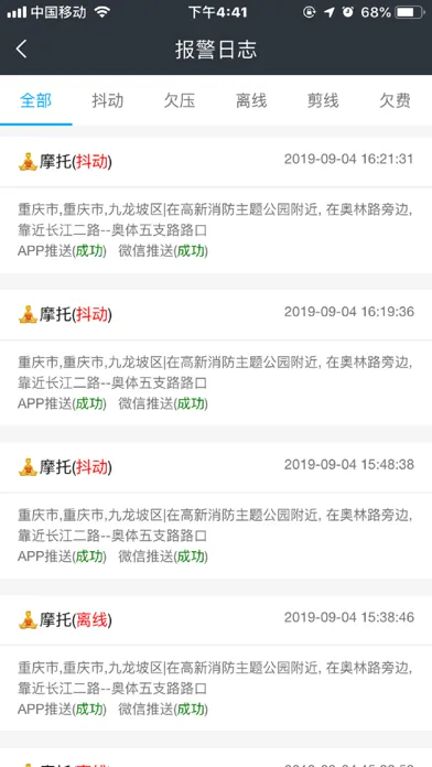 2.当设备发出震动、剪线、离线、欠压报警后,会给用户推送报警信息(包括报警地理位置、报警类型、报警时间),让用户实时掌握自己摩托车的安全信息;