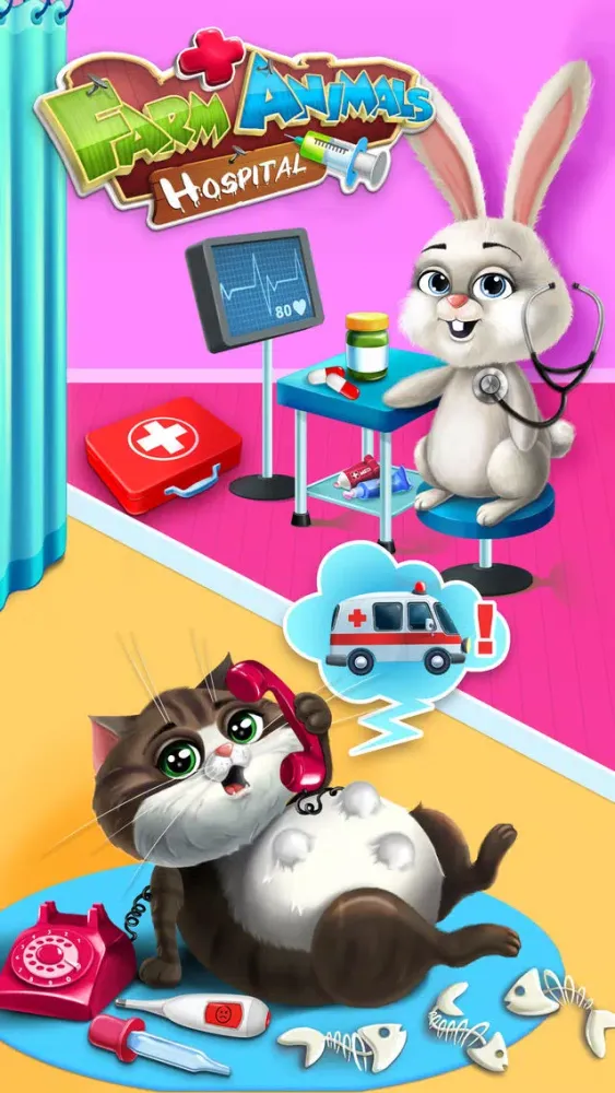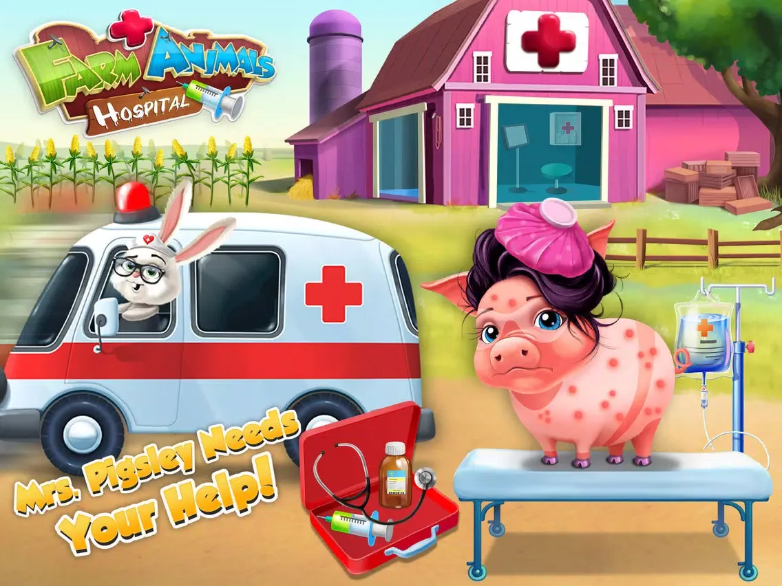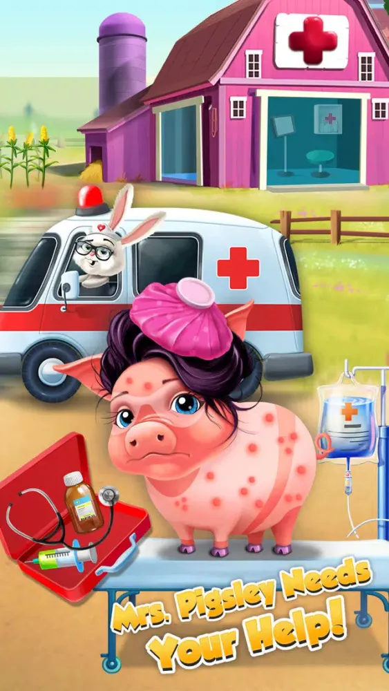 Farm Animals Hospital needs a new doctor! Do you have what it takes to become the best pet vet? Get your doctor tools and play super fun animal games for girls and boys. Treat seven farm animals: a cat, dog, pig, cow, donkey, rooster and new patient bunny!