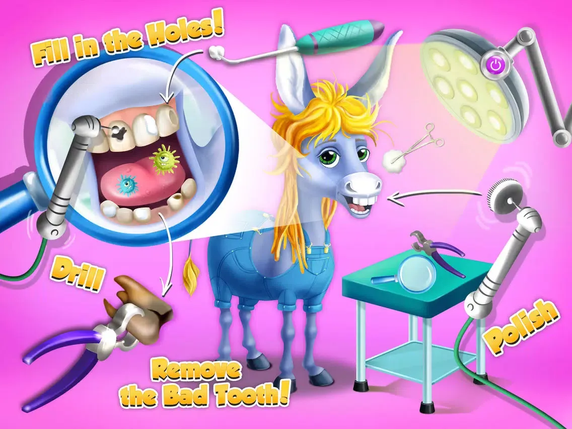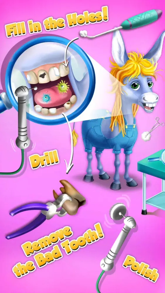 · Rush to the dentist office where Billy the donkey is waiting and fix the teeth!