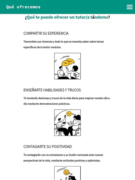 Con Tándems ASPAYM cualquier persona con lesión medular puede contactar con veteranos/as, que ejercerán el rol del 'tutor/a'. A partir de su propia trayectoria, estas personas veteranas compartirán sus vivencias sobre cómo adaptarse a la nueva situación y dibujar otra vez un proyecto de vida.