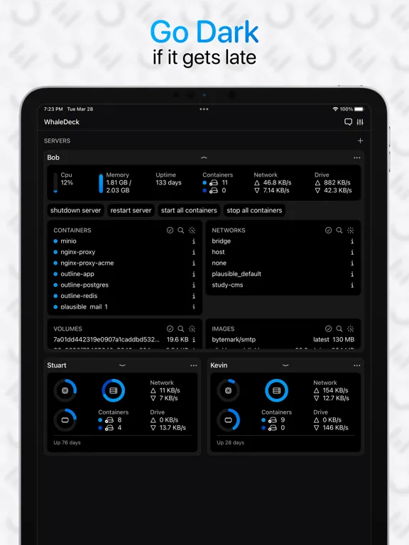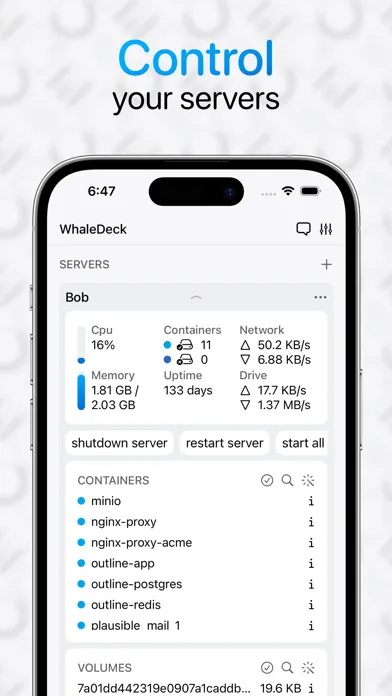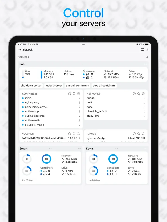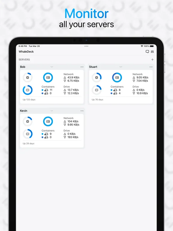 Monitor your containers with ease, thanks to WhaleDeck's real-time visualization of CPU, memory, drive and network usage. Keep track of your container logs and quickly identify issues with the built-in log viewer. And with support for multiple servers at once, you can easily manage all of your Docker environments from one place.