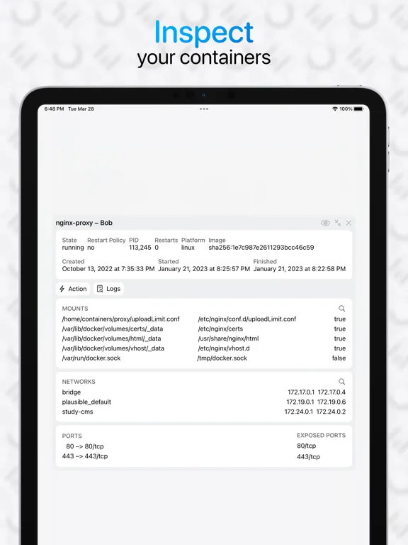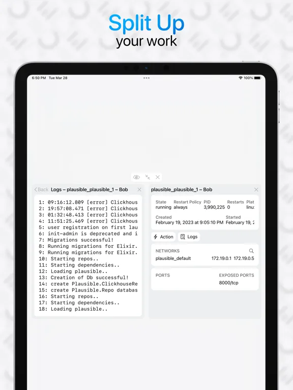 Take control of your containers with the ability to run actions like start, stop, and pause on a single container or at multiple containers at once. And with the Split View feature, you can work more productively by seeing multiple parts of your Docker environment side by side.