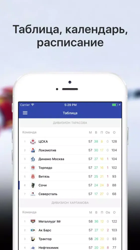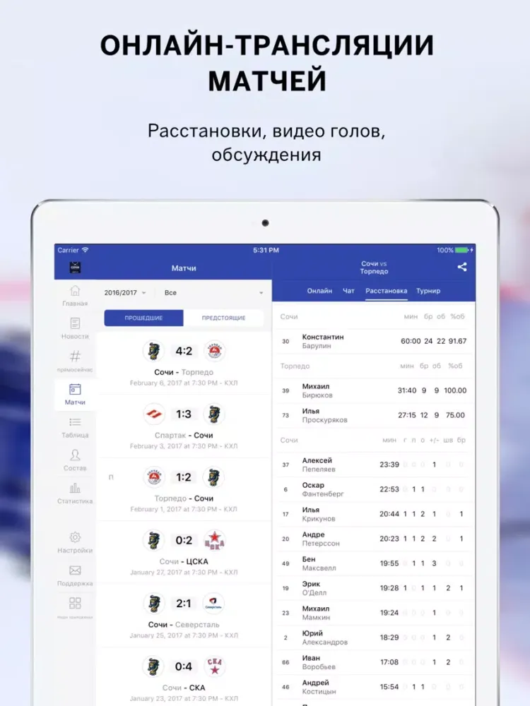 • Текстовые трансляции матчей, календарь и таблица КХЛ;