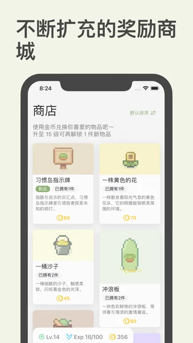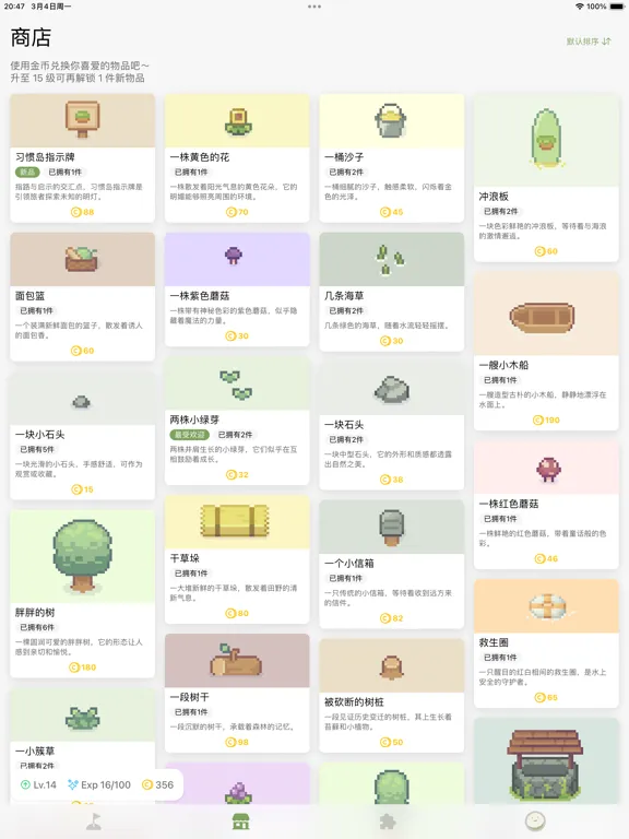 「习惯岛」是一个游戏化的习惯打卡应用。在这里,你可以自由定制一些习惯卡片,甚至是设定目标和挑战。然后在打卡习惯的同时,你会随机获得一些金币、经验之类的奖励。当你攒下一些金币后,就可以购买自己喜欢的物品装饰在小岛上,让你的小岛变得生机勃勃。而随着经验的累积不断升级之后,你也会解锁更多物品、功能和玩法。