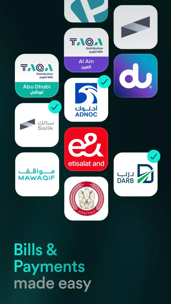 - Payment of utility bills (ADNOC, Etisalat, Du, TAQA), traffic fines, Mawaqif parking, and tollgates