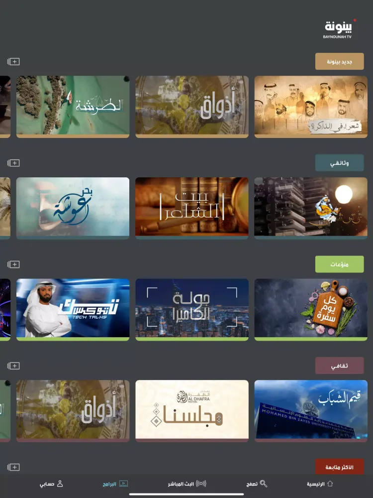 Baynounah TV is more than just a television channel; it is a window into the daily lives of the Emirati community. As a pioneering broadcaster, it focuses on showcasing national and local heritage through a diverse array of programs. From social awareness and health to heritage and cultural topics, each episode is crafted to enrich your understanding and appreciation of Emirati traditions and values.