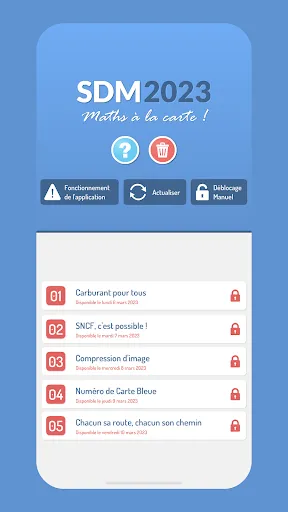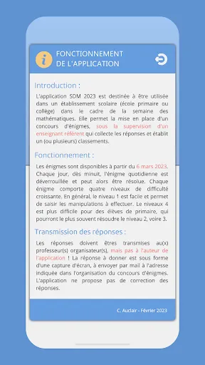 L'application SDM 2023 est destinée à être utilisée dans un établissement scolaire (école primaire ou collège) dans le cadre de la semaine des mathématiques. Elle permet la mise en place d'un concours d'énigmes, sous la supervision d'un enseignant référent qui collecte les réponses et établit un (ou plusieurs) classements.