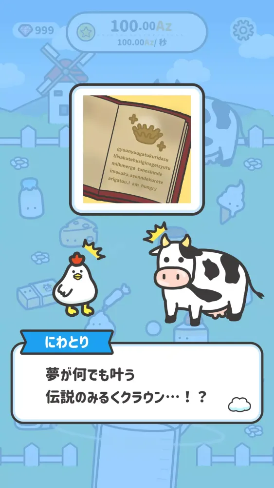 You start with a single cow on a deserted ranch. In an old book from the history museum, you find a legend about the Milk Crown, a mythical item that can fulfill any wish. As you seek to rebuild the ranch, you encounter a cow practicing flying in the sky, determined to become a flying cow. Will you uncover the Milk Crown and help the cow achieve its dreams?