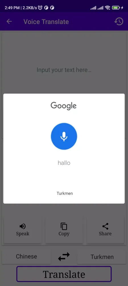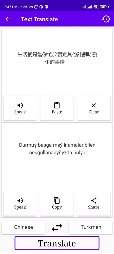 Type your text and get instant Chinese to Turkmen translation. The app supports bidirectional translation, allowing you to translate both from Chinese to Turkmen and vice versa. Whether you need to translate single words, phrases, paragraphs, or complete sentences, this application provides seamless and accurate translations.