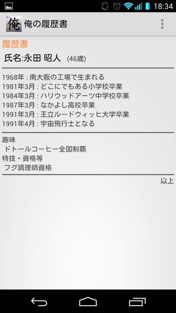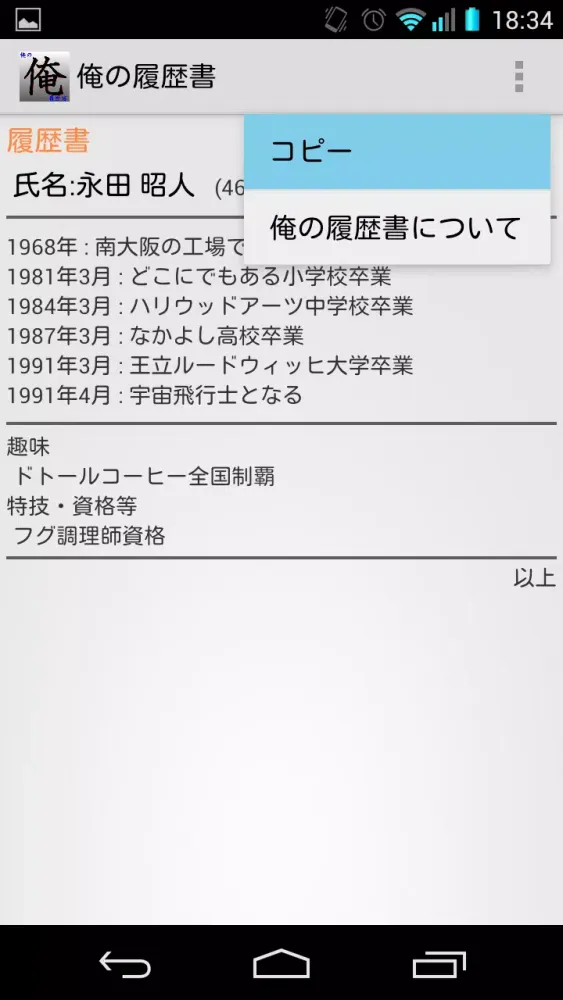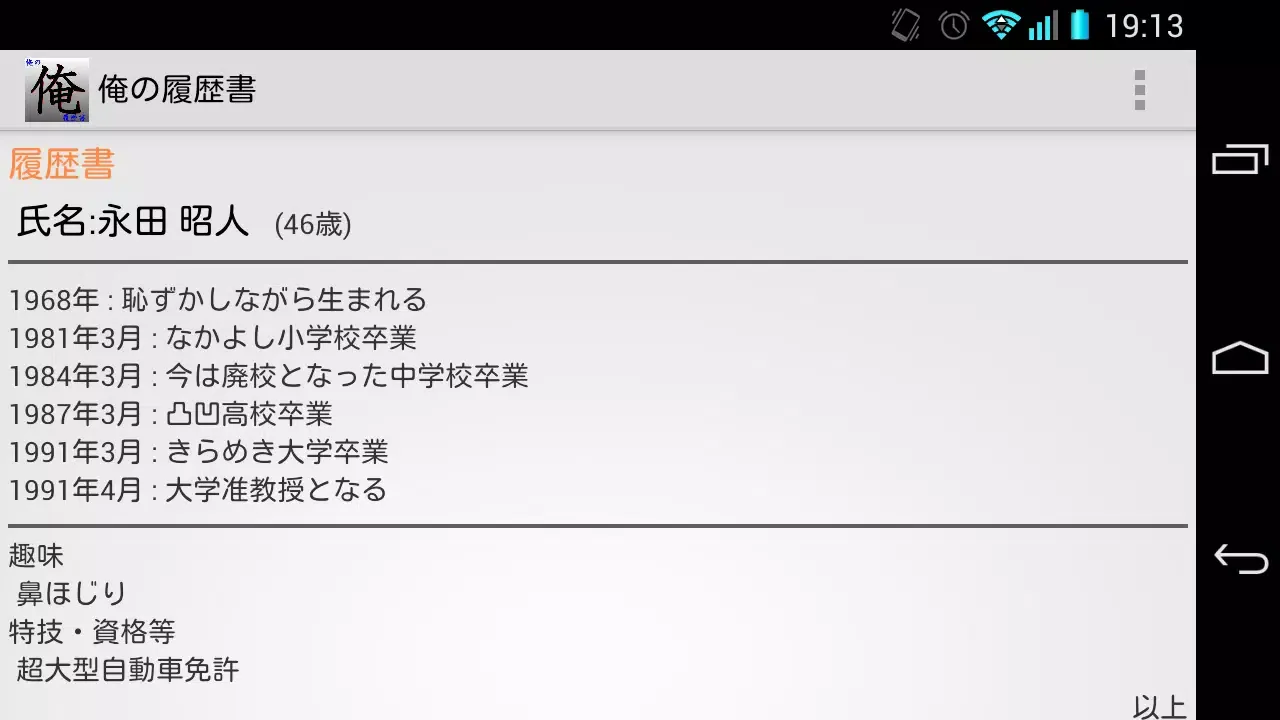 One of the standout features of "俺の履歴書" is its ease of use. Once the resume is generated, you can easily copy the text and paste it wherever you desire—be it a blog post, email, or even a fictional character's backstory. It’s a testament to the app’s versatility and how seamlessly it integrates into various digital contexts. Moreover, the developer behind this delightful creation has been officially recognized as a trusted and secure app creator by the Android community. You can verify their credentials at Androider.jp, ensuring peace of mind while enjoying the app.