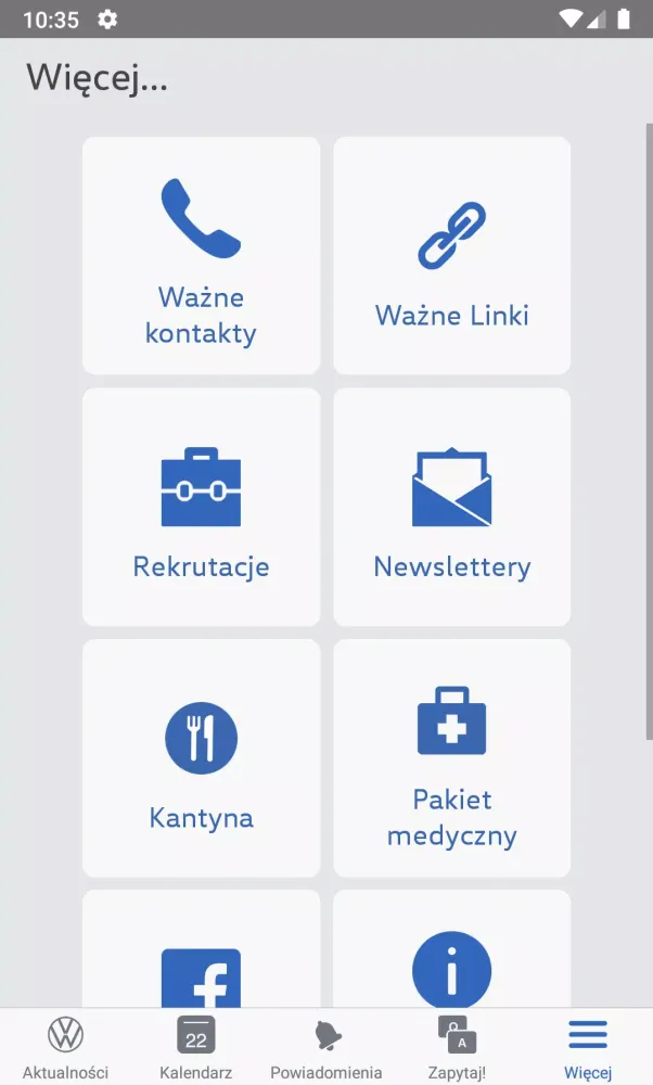 If you work at Volkswagen Poznań, logging into the application as an employee will grant you exclusive access to a wealth of valuable resources. From the moment you log in, you'll receive timely updates about company news, vital contacts, frequently asked questions, and more. Here’s what you can expect: