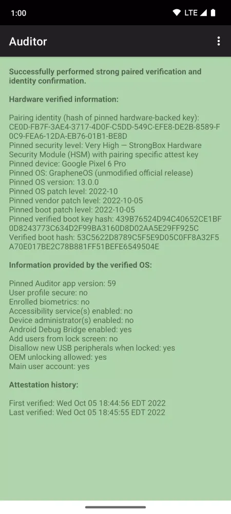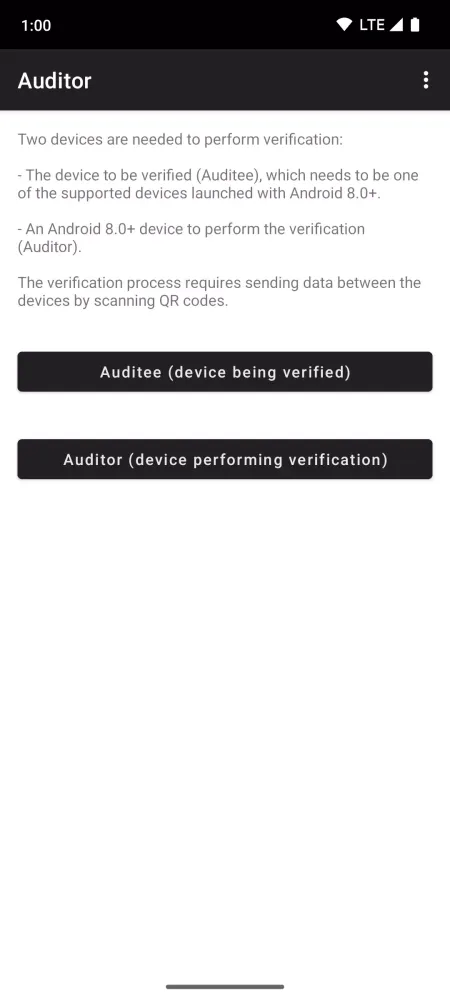 The Auditor app is designed to validate the security of a device using hardware-based integrity and identity verification. It leverages the built-in security features of supported devices to ensure that the operating system remains unaltered and intact. Specifically, the app checks whether the device is running the original manufacturer's operating system with a locked bootloader, ensuring that no unauthorized modifications have been made.