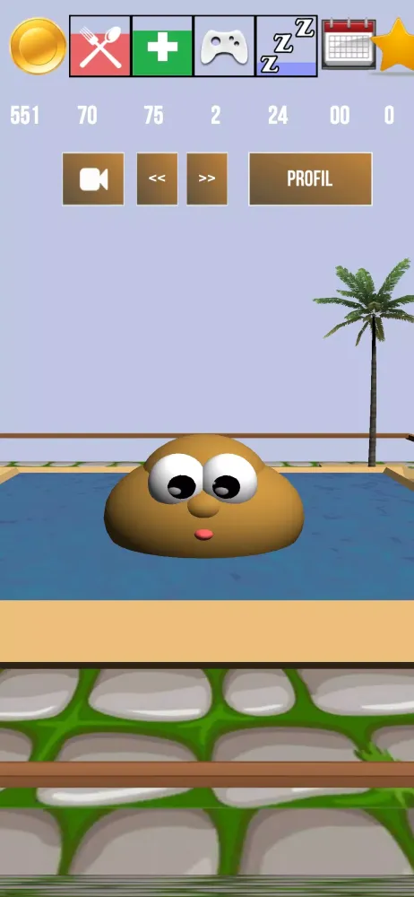 - Sleeping: Let Potaty rest in bed or on a sun lounger. Sleeping is crucial for Potaty’s energy levels.