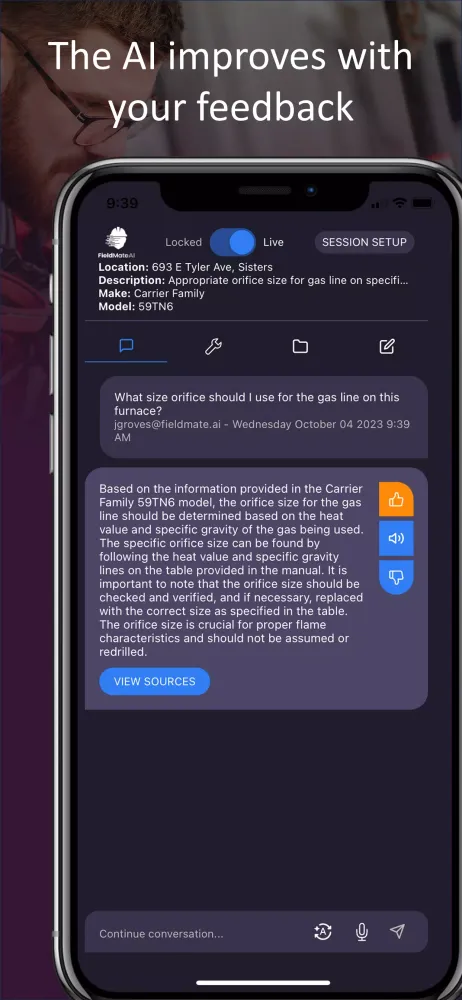 Central to FieldMateAI's design is its focus on efficiency. The app takes into account the service job location, the equipment on-site, and past "conversations" that have taken place. This ensures that you can quickly access the information you need to resolve in-field issues swiftly. By maximizing your productivity, you can help more customers each day.