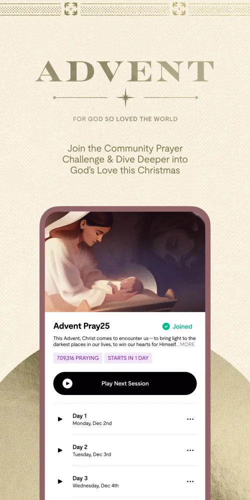 - Community: Participate in communal prayer challenges like Pray40 during Lent and Pray25 during Advent.