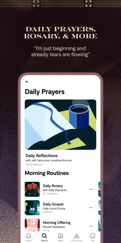 - Daily Prayers & Devotionals: Engage in daily prayers using methods such as Lectio Divina, the Holy Rosary, the Divine Mercy Chaplet, and Daily Mass Readings.