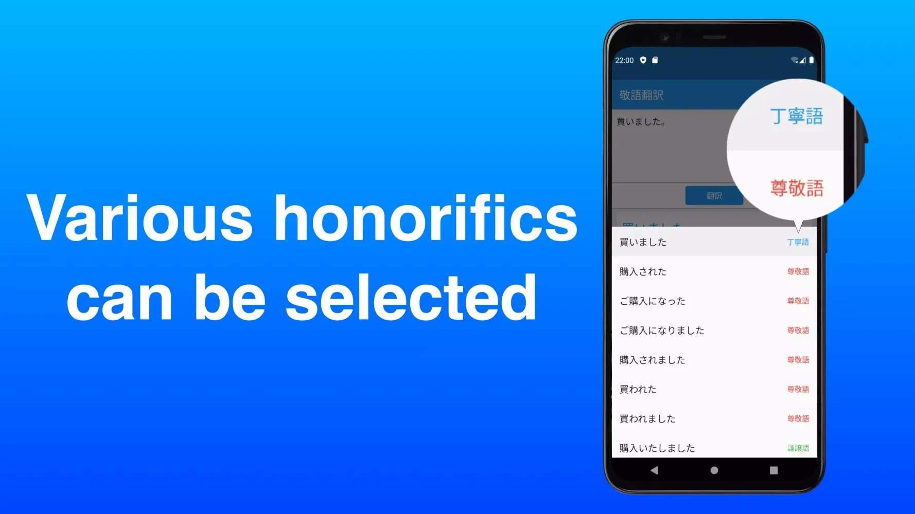 Each of these styles serves a unique purpose in Japanese communication, making it crucial for users to master them for effective interaction. After converting or generating sentences, users can tap on the words to adjust the honorific type based on the context of the sentence.