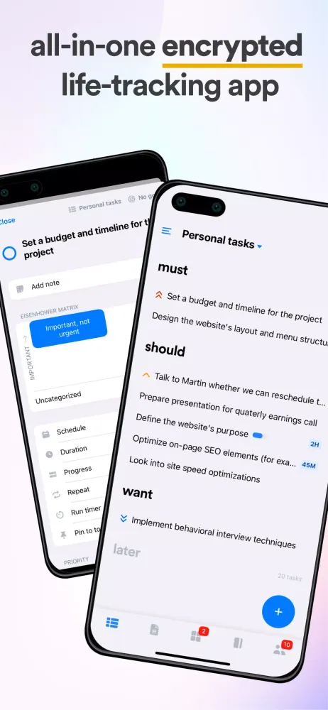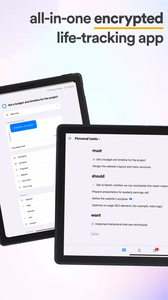 Your data is protected with end-to-end encryption using industry-leading algorithms. Lunatask does not sell your data and does not track your in-app usage. You retain full control over your information.