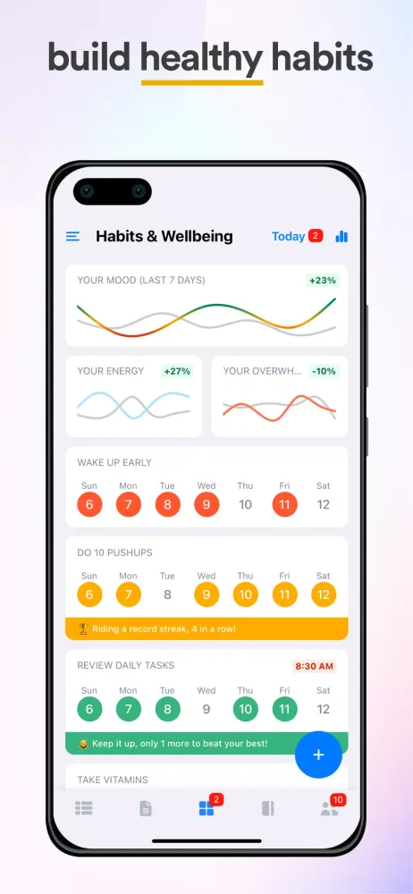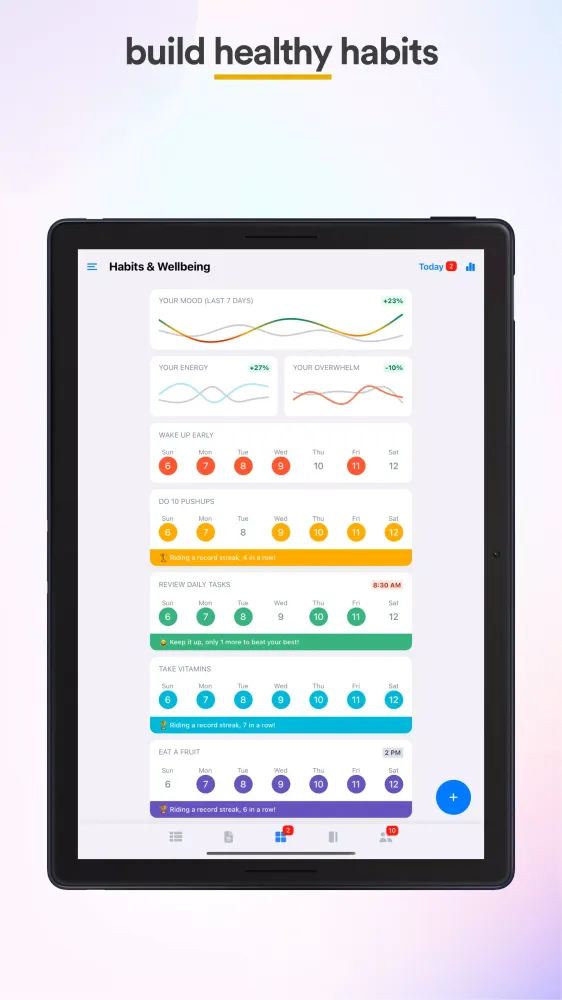 Managing mood swings, stress, anxiety, or depression can be difficult. Lunatask helps you gain visibility into your emotional state over time. Use the mood and emotion tracker, energy level tracker, and stress level tracker to monitor your mental well-being and identify how new habits impact your overall health.