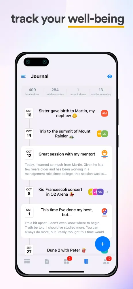 Keep a log of your thoughts, feelings, and experiences for self-expression and reflection. Protect your entries with PIN protection and use customizable templates for detailed entries. This feature helps you track your mental well-being and personal growth over time.
