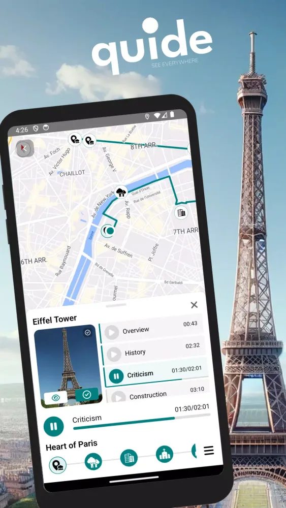 With QuideApp, you won't just be mapping out your itinerary; you'll be diving deep into the heart of each destination, experiencing its soul through engaging narratives and immersive audio tours. Transform your next adventure into an unforgettable exploration with QuideApp — your personal guide to the world.