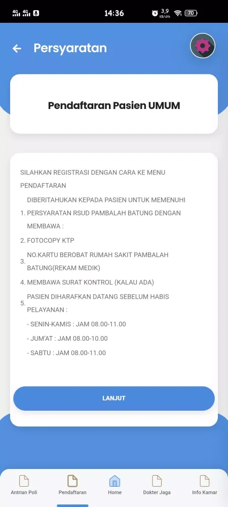 To begin using the application, patients are required to register by navigating to the "Pendaftaran" (Registration) menu. The registration process is straightforward but requires careful preparation to ensure compliance with hospital policies. First and foremost, patients must bring a photocopy of their ID card (KTP) as proof of identity. Additionally, it is essential to have your Hospital Medical Record number (No. Kartu Berobat Rumah Sakit Pambalah Batung). If applicable, patients should also bring a control letter (Surat Kontrol) from their previous visit. These documents are crucial for maintaining accurate records and ensuring continuity of care.