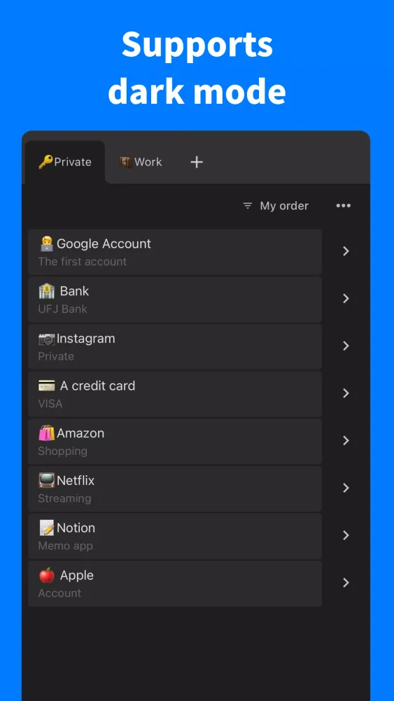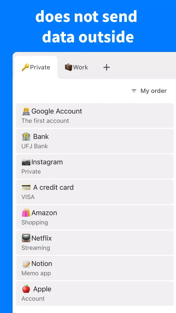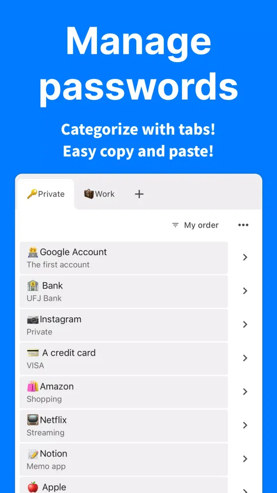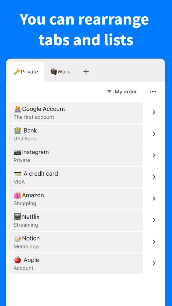 One standout feature of the Password Manager is its flexibility when it comes to tab management. Users can create an unlimited number of tabs, categorizing them based on personal preferences. For instance, you might separate work-related logins from personal accounts, streamlining the entire process. Furthermore, the app allows for free rearrangement of both tabs and individual tasks within those tabs, offering complete control over how your information is structured. Whether you prefer dragging items around or manually adjusting their positions, the interface adapts seamlessly to meet your needs.