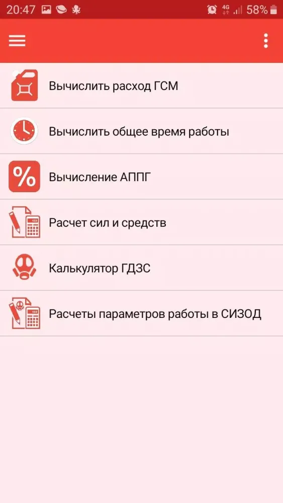 One of the key features of this application is its built-in calculator. It enables users to compute vital metrics such as APPG (Average Power per Unit Area) and GDZS (Total Fire Extinguishing Capacity). Additionally, it offers tools to determine the operational duration during firefighting activities and to calculate the required amounts of fuels and lubricants. These functionalities ensure that supervisors can make accurate assessments and decisions in real-time, enhancing the efficiency and effectiveness of their operations.