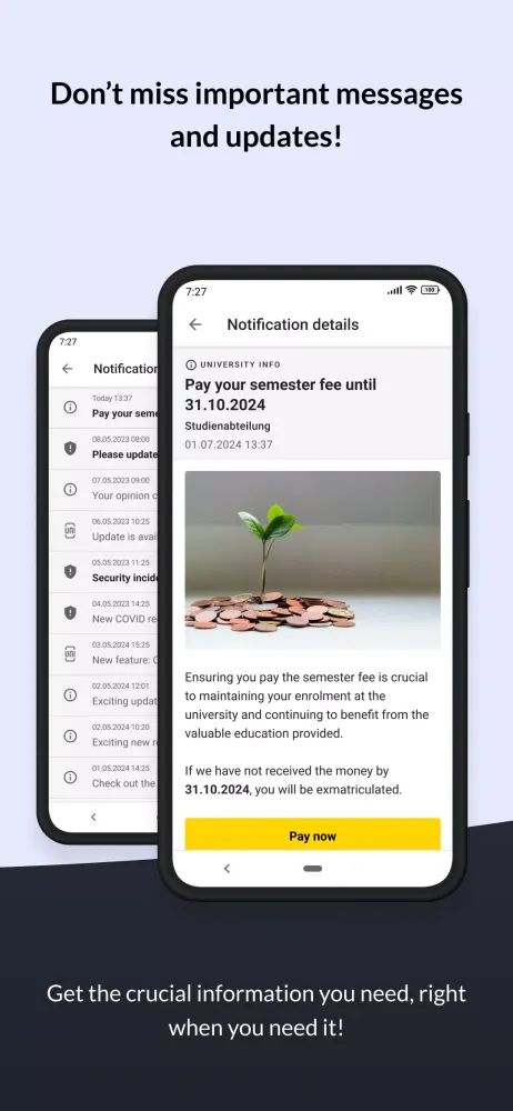 At its core, youni offers a streamlined approach to managing your university life. It provides a compact yet comprehensive view of your educational commitments, allowing you to access critical resources effortlessly. With quick shortcuts to vital university services, navigating through course materials, registering for exams, and checking grades becomes seamless. This efficiency empowers students to focus more on learning rather than administrative hurdles. For instance, you can easily organize your schedule, ensuring no deadlines slip through the cracks while keeping track of your performance metrics conveniently via your mobile device.