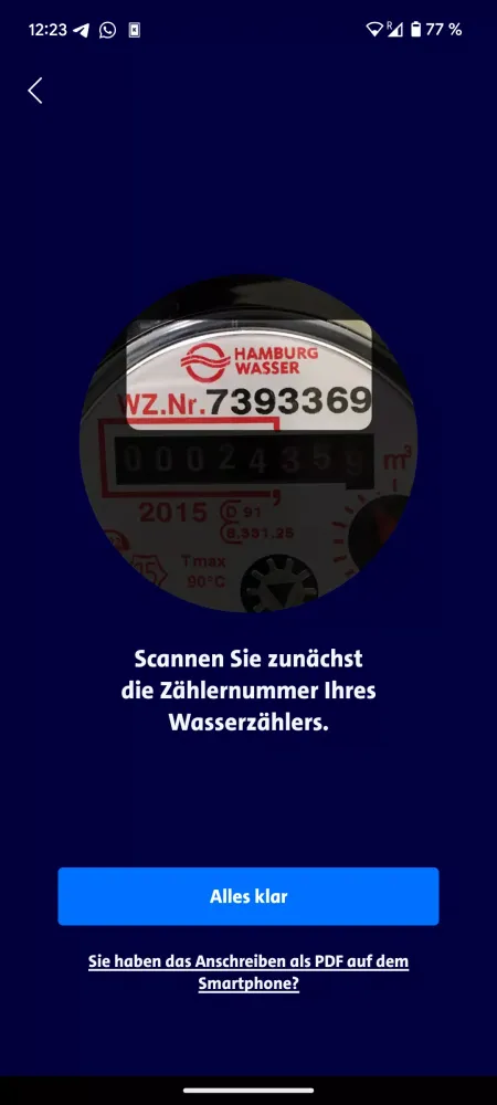 Begin by scanning the QR code located on your cover letter using the app. This QR code contains all the necessary order data for a successful transmission of your readings. The app will automatically load your data and any stored water meters, streamlining the entire process.