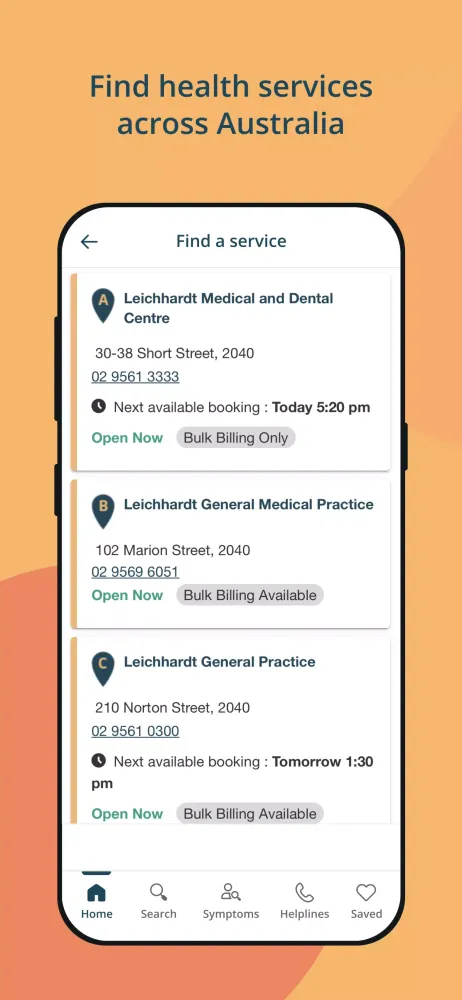 Beyond symptom management, the app offers a wealth of practical utilities. You can easily locate nearby health services across Australia using the app's extensive directory. Whether you're searching for a general practitioner, hospital, or pharmacy, the app provides detailed contact information and directions based on your current location. This makes it an invaluable resource for times when you need immediate care or want to explore different healthcare options.