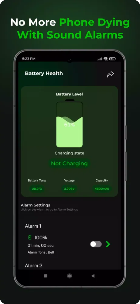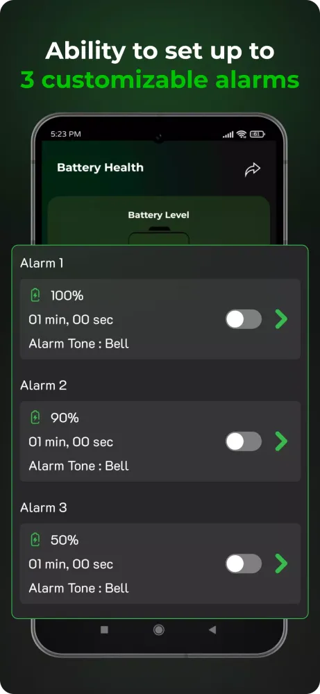 Custom Battery Alerts: Set alerts for low or full battery and choose from multiple tones. This feature ensures you won't miss important notifications when your battery is running low or has reached its maximum capacity.