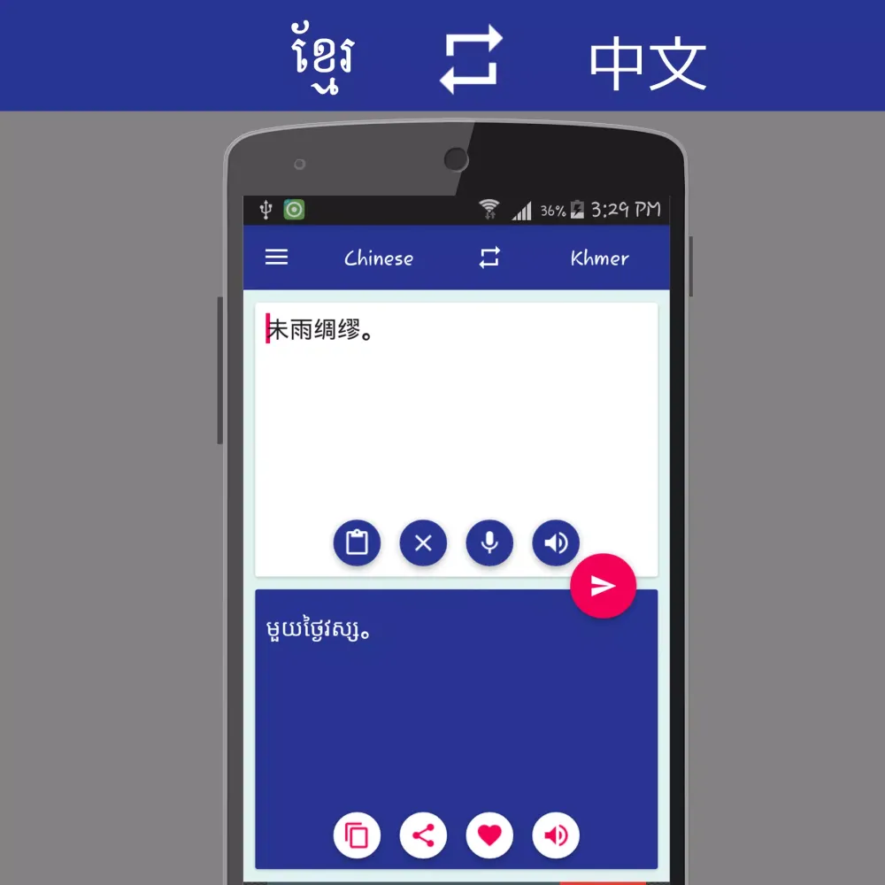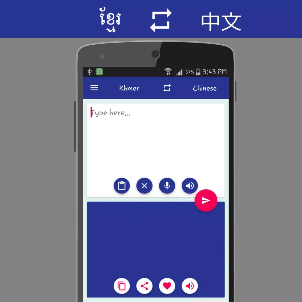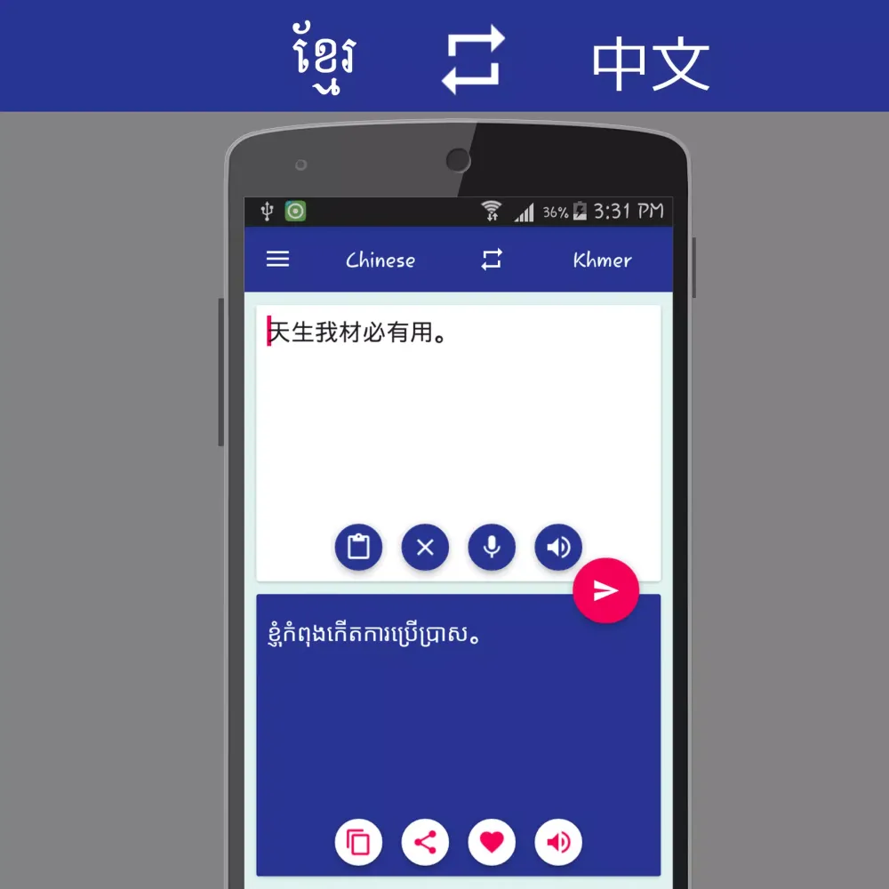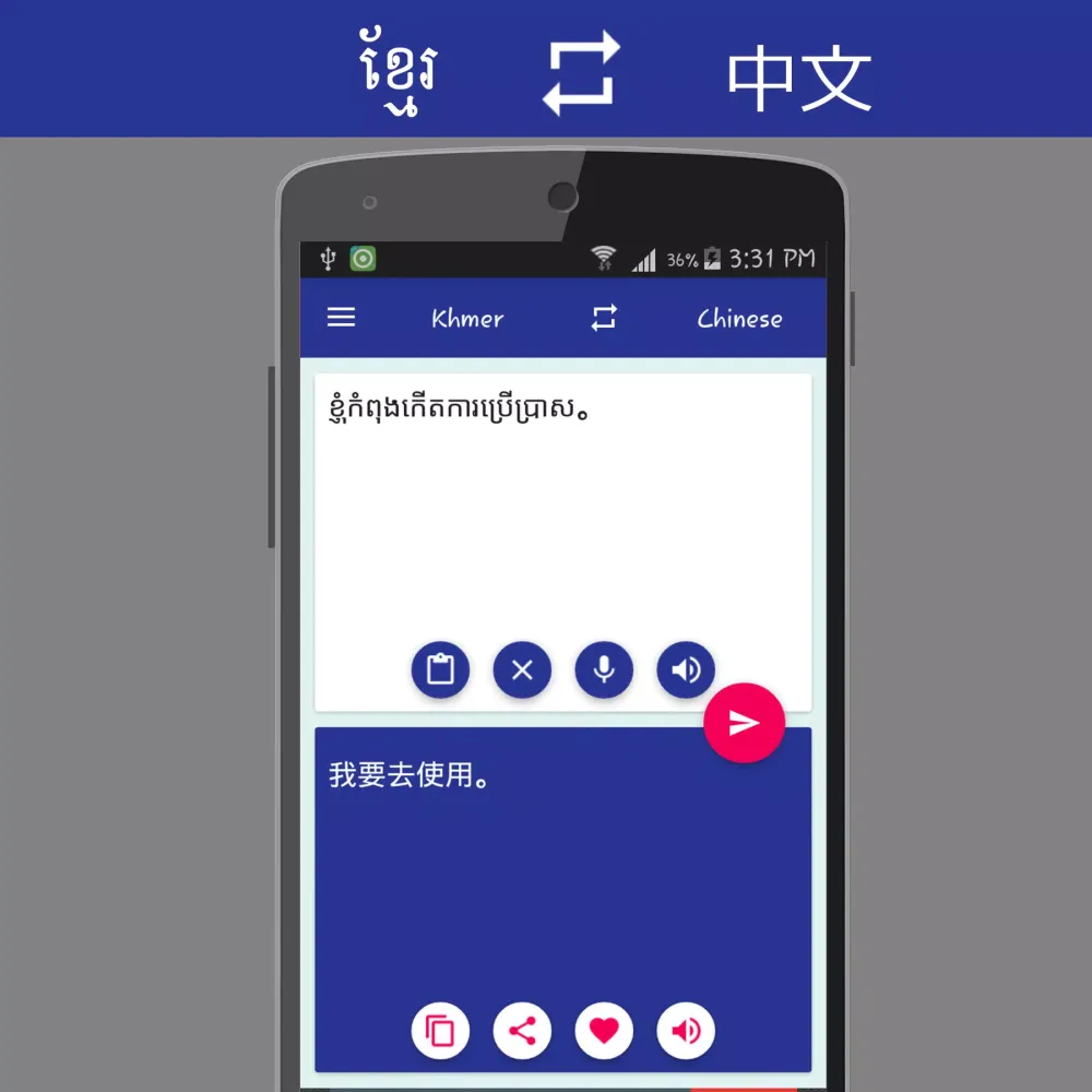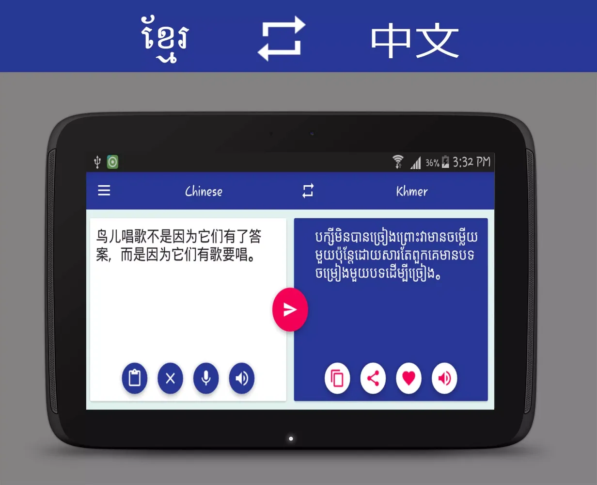 One of the standout features of the Khmer Chinese Translator is its simplicity. The app sports a straightforward user interface, making it accessible even for those unfamiliar with translation tools. Users can enjoy listening to translated sentences or words spoken aloud in either Khmer or Chinese, enhancing comprehension and pronunciation practice. Additionally, the app supports social media integration, allowing users to share translations easily with friends and family. A material design approach ensures that the app remains user-friendly across various devices, including phones and tablets.
