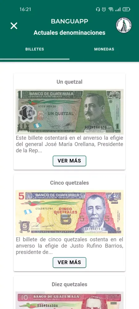 Beyond financial data, BANGUAPP offers a rich collection of content related to the Guatemalan currency and numismatics. Discover fascinating historical facts, detailed descriptions of banknotes and coins, and learn about the evolution of the Quetzal. Additionally, the app provides exciting opportunities to engage with the Numismatic Museum: