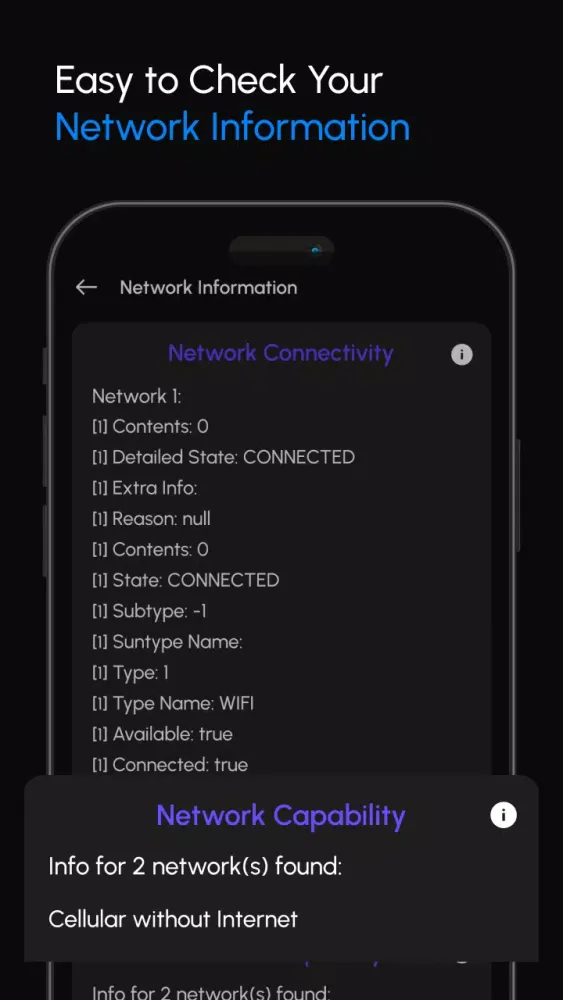 Users can easily discover detailed information about their current network connection, including the connection name and upload/download speeds. Explore additional features like 5G/4G Force LTE and other useful network resources. Test for compatibility, signal strength, internet accessibility, network, carrier, and SIM data. Leverage the latest and most effective technologies to elevate your online experience.