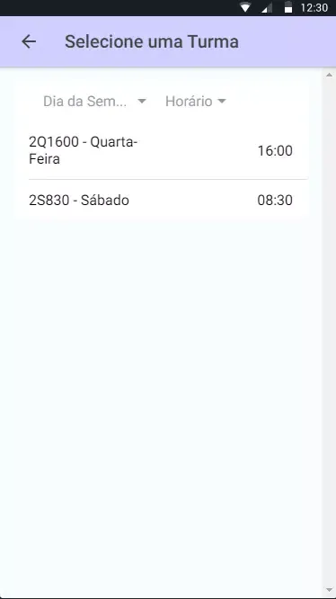 In this step, the individual can browse through the list of available classes. They can filter these classes by day of the week and time. After selecting the desired class, pressing the button will redirect them to the final screen.