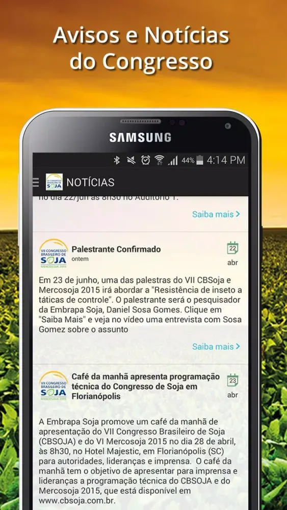 With CBSoja 2015, you can make the most out of your experience at the VII Brazilian Congress of Soy by staying informed, organized, and connected.