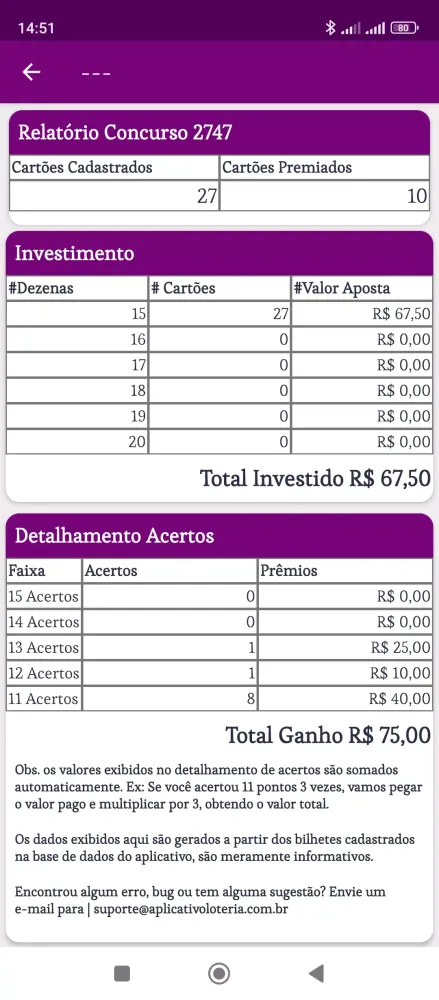 It’s important to note that "Resultados da Loteria" operates independently of Caixa Econômica Federal and the Brazilian government. While the app sources its data from the official Caixa website, it is neither affiliated nor endorsed by these entities. Consequently, Caixa and the government bear no responsibility for the app's content or functionality. The app strictly serves as a tool for displaying results, providing statistics, and offering combination generation utilities. Importantly, it does not facilitate betting or gambling activities.