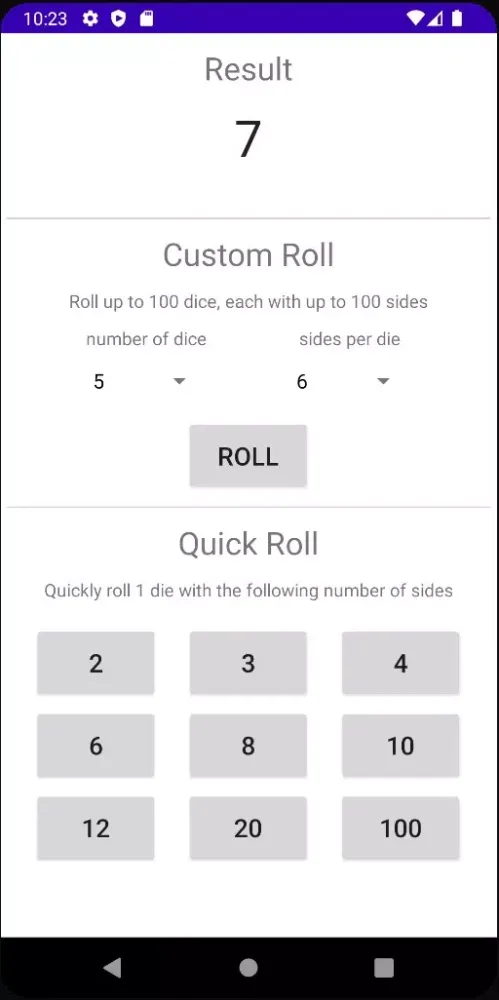 Quick Roll: This feature allows you to rapidly roll a single die with common sizes such as d6, d10, d20, and others. The interface is intuitive, enabling users to select the desired die size and roll it with minimal effort.