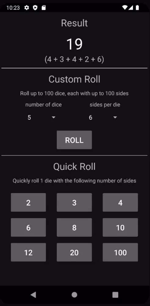 Custom Roll: For those who require more complex scenarios, the Custom Roll option lets you roll up to 100 dice, each with up to 100 sides. This feature is ideal for intricate game mechanics or large-scale simulations where precision and variety are key.