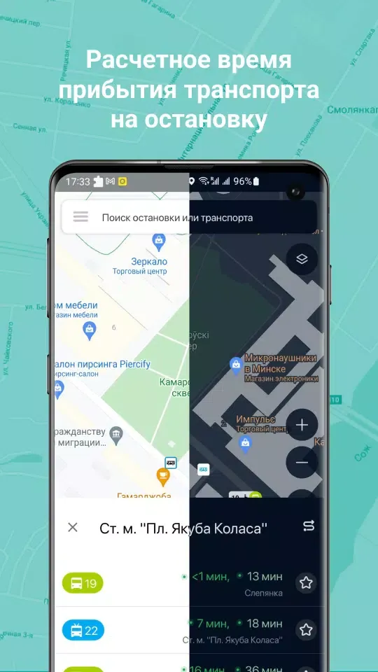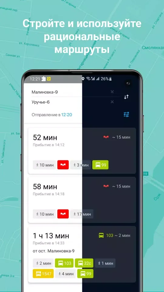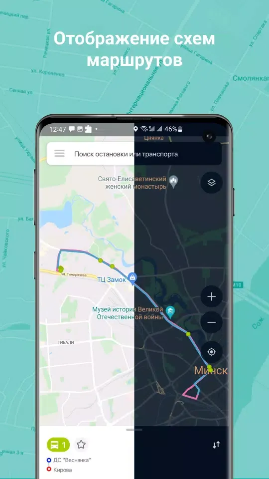 Plan your route using the app with the public transport modes that suit you—buses, trolleybuses, streetcars, and shuttles. Choose your current location, a transport stop, or simply a place on the map to build your route.