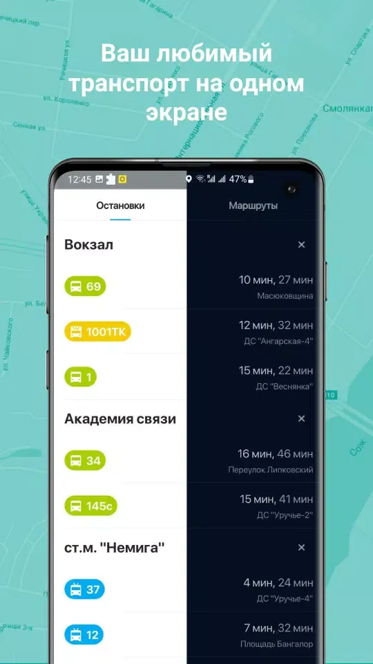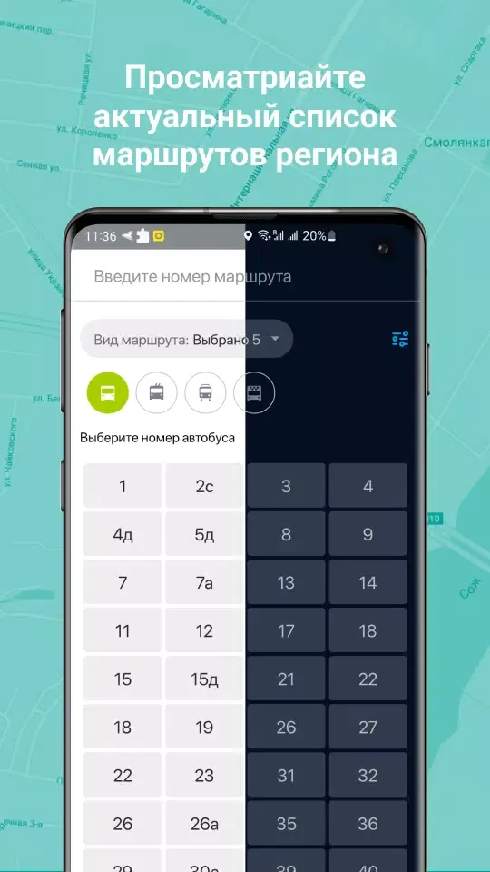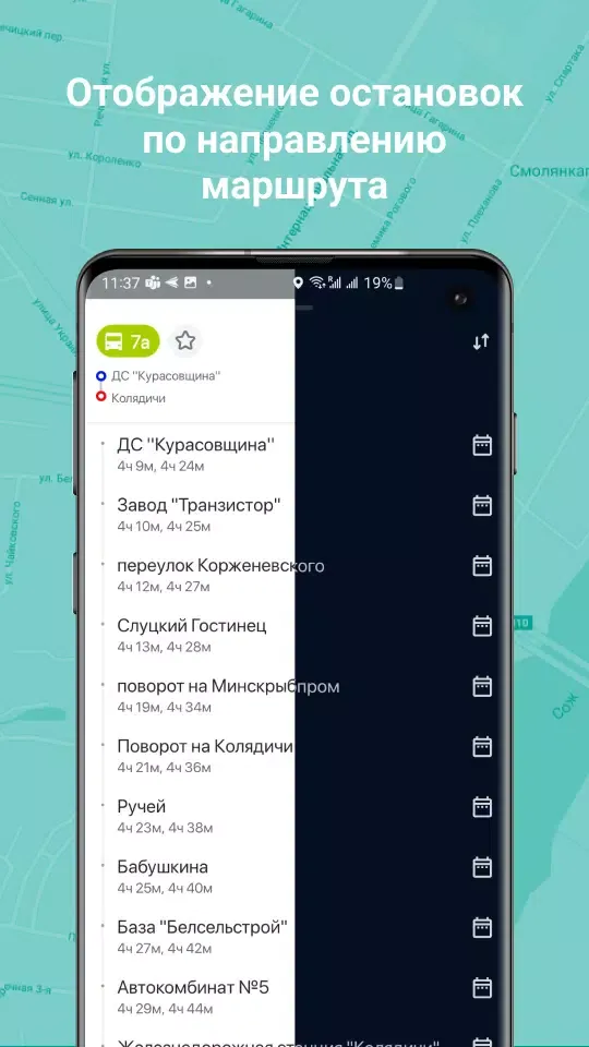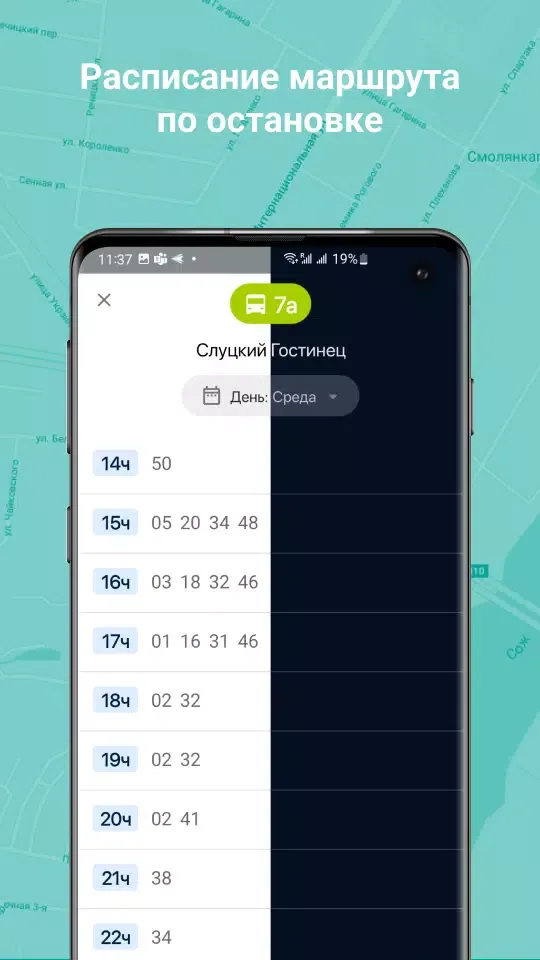 The application allows you to build routes and view the schedule not only in cities but also in the district and region. Simply move the map to the desired point and you will immediately see the schedule for that region.