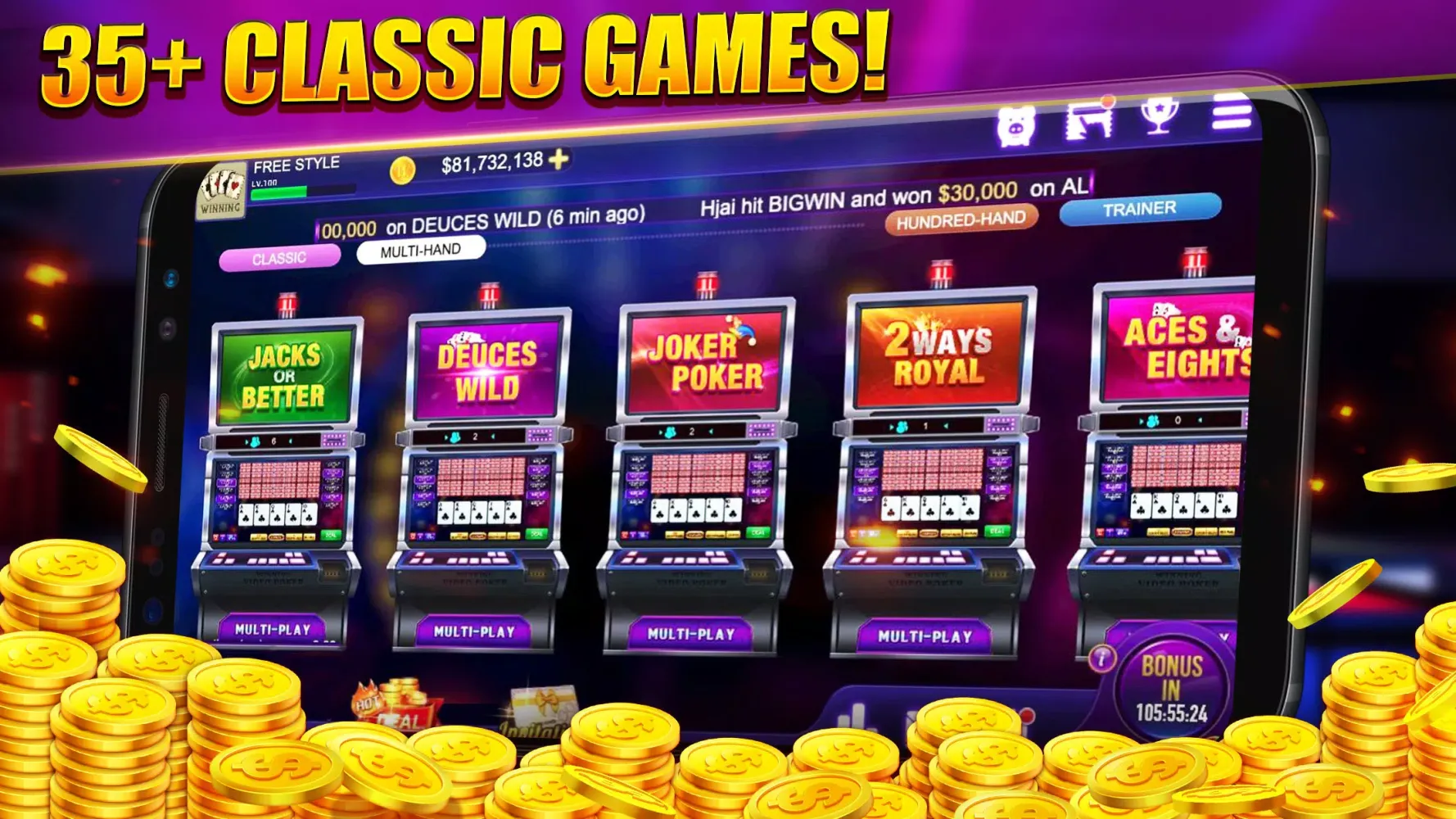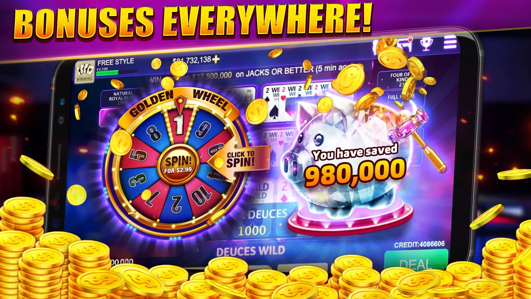 We believe in rewarding our players generously. That's why Winning Video Poker offers numerous incentives to enhance your gaming experience. Newcomers will be thrilled to know they receive 25,000 free coins to help them level up quickly. Additionally, there are numerous daily bonus coins and huge online bonus coins every three hours. Keep an eye out for the golden wheel, which can land you even more rewards! The game also features a Scratch to Get Coins mechanic, where you can earn coins completely free. Breaking open the Piggy Bank allows you to collect bonus coins saved in each deal, adding an extra layer of excitement.