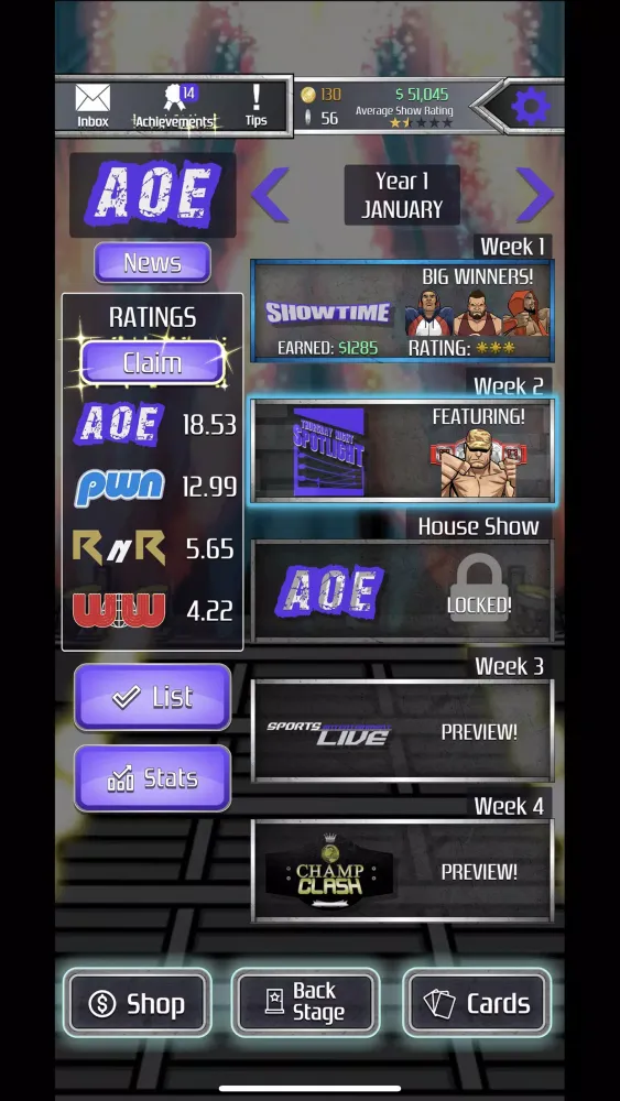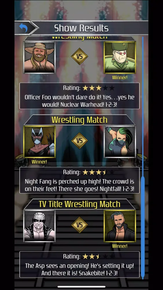 Experience the most comprehensive wrestling simulation available on mobile. Track the statistics of all your wrestlers, explore detailed title histories, and follow top contender rankings. Year-end awards and other features ensure that every aspect of your promotion is meticulously managed.