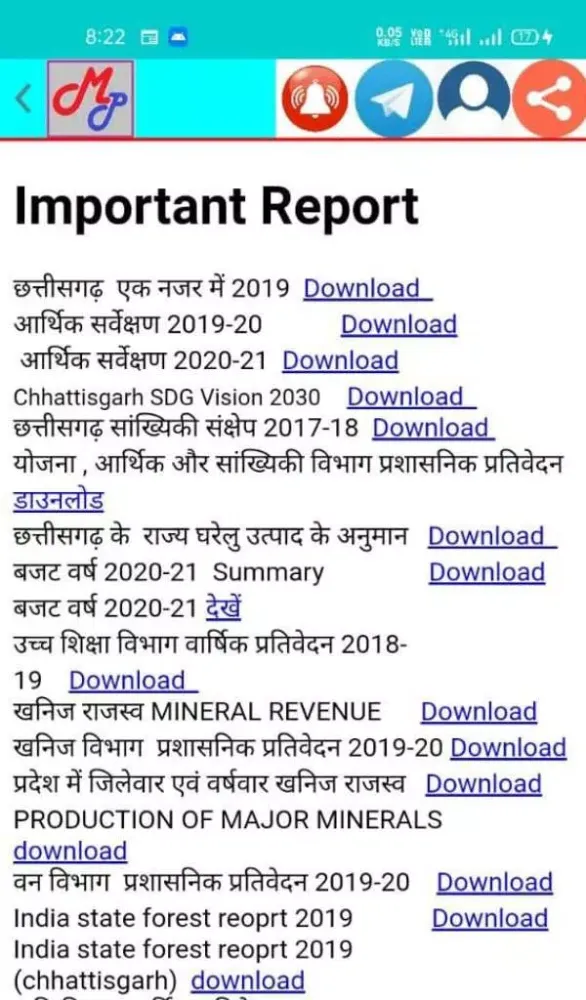 The app's download section includes essential documents such as Economic Survey 2020-21, Budget 2021-22, Chhattisgarh policies on electric vehicles, solar energy, and various administrative reports related to forests, minerals, agriculture, women and child development, panchayats, and more. Books and event chronicles covering all subjects are also provided, making it a comprehensive resource for exam preparation. Links to websites of various departments including CGPSC, CGVYAPAM, CSEB, SSC, UPSC, CG E-Gazette, District Courts, CG High Court Case Status, and more are also available, providing users with direct access to official resources.